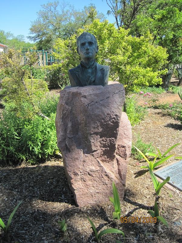 Then we stopped at the Marketplatz Square where there a park with several caches in it. The first cache was in some rocks that had a bunch of holes in them. Then we walked around looking at several of the attractions in the park. This Square, originally a two-block area which included what is now called the Courthouse Square, has been at the center of Fredericksburg since the city's founding in 1846. The area was still heavily forested when the town's Vereins Kirche was built in the center of Main street in 1847. The octagonal building served as a community church, meeting place, school, and refuge from possible Indian attacks. A county jail was built on the Square in 1852. In 1856 a public schoolhouse was constructed and the school classes moved out of the Vereins Kirche. In 1911 the schoolhouse was converted to serve as headquarters for the volunteer fire department. The Vereins Kirche, demolished in 1897, was reconstructed in 1934-35 as a pioneer memorial, serving as the county's first museum (1936) and library (1939). As part of its centennial celebration, the State of Texas erected a monument on Market Square in honor of Baron Ottfried Hans Freiherr Von Meusebach, whose colonization efforts led to the founding of Fredericksburg. Pioneer Garden was dedicated to the founders of Fredericksburg and also to other notable people in Gillespie County history. Several statues are found among the beautiful winding paths as you can see by the pictures. Then we did a 6 step virtual cache in the garden that had to do with the statues there. It certainly was a lovely small park and so nice to walk through. Another of the things we saw in the Square was the Vereins Kirche Museum. Located in the center of Marktplatz, Main Street this unique structure is one of Fredericksburg's best known landmarks and is in the heart of town. Vereinnss Kirche (German for "Society Church") is commonly called the Coffee Mill Church due to its unique structure. Information of the history of the "Society's Church" is entertaining and educational.